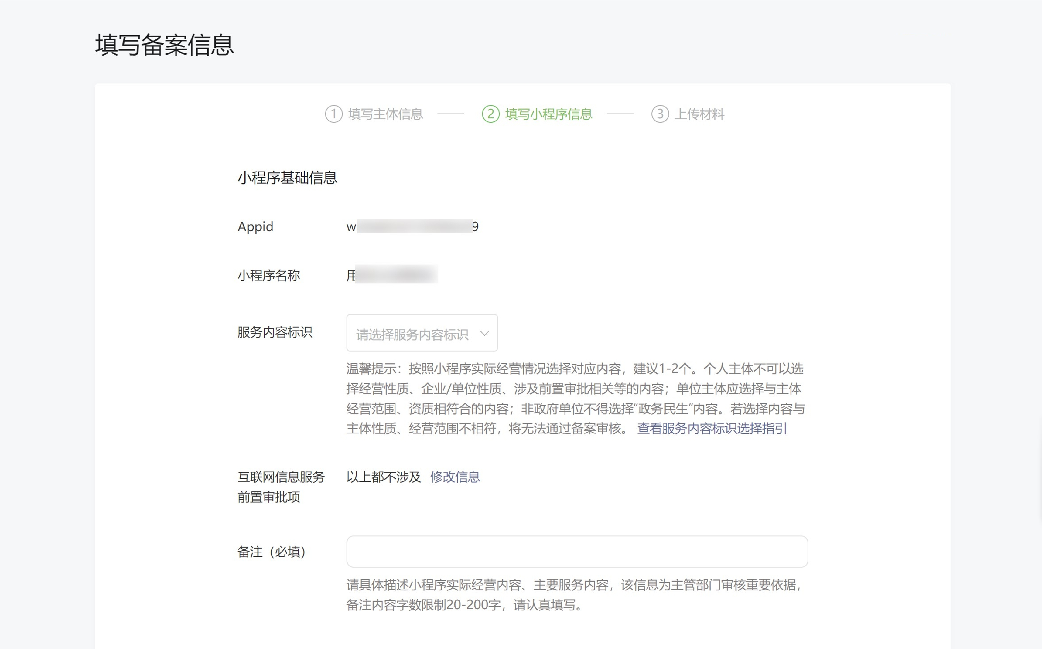 | ①服務(wù)內(nèi)容標識:根據(jù)小程序?qū)嶋H運營內(nèi)容選擇合適的即可 | 小程序服務(wù)內(nèi)容類型數(shù)目不能超過5個 | 服務(wù)內(nèi)容標識是通信管局對各個行業(yè)的分類,平臺部分行業(yè)類目與管局行業(yè)類目名稱不完全不一致,建議根據(jù)備案小程序?qū)嶋H運營內(nèi)容盡可能選擇對應(yīng)的服務(wù)內(nèi)容標識,最多選擇5個。 |