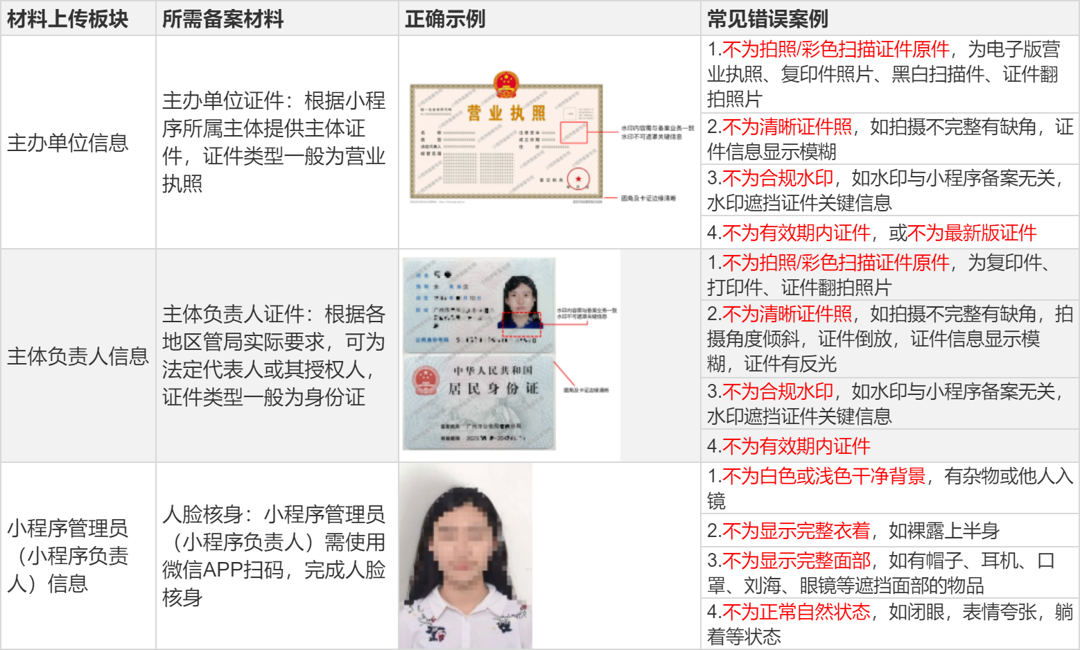 | ③負責人名稱:通過上傳證件自動識別,有誤可自行修改 | 【小程序負責人姓名】負責人與小程序管理員不一致 | 請核實小程序是否未完善管理員實名信息,需參考指引文檔進行補充 |