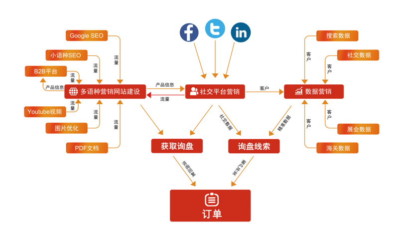 多渠道智能營銷系統(tǒng),從網(wǎng)站架構(gòu)開始就全面植入了整站SEO技術(shù),網(wǎng)站建成后就開始SEO。多語種網(wǎng)站分別對應(yīng)GOOGLE搜索引擎的多語言站點的SEO,并同步帶動Bing,Yahoo,Ask,AOL,Yandex等主流搜索引擎的SEO。通過關(guān)鍵詞SEO、B2B平臺、圖片、視頻、PDF多種引流方式超強引流,確保網(wǎng)站流量全年無憂。在SEO推廣方面,只需要外貿(mào)公司提供關(guān)鍵詞。外貿(mào)云有20多個人專業(yè)的外貿(mào)推廣團隊,一對一專門為企業(yè)提供SEO推廣方案,直到把網(wǎng)站關(guān)鍵詞的排名全部做上去以后,才會收取推廣費用。