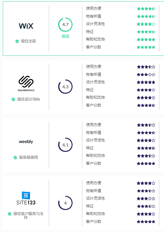 Wix和Weebly是市場(chǎng)上最受歡迎的兩個(gè)外貿(mào)網(wǎng)站平臺(tái),其直觀的拖放功能使網(wǎng)頁(yè)設(shè)計(jì)像兒童游戲。Squarespace適合做創(chuàng)意類型的網(wǎng)站,而Site123非常適合小型網(wǎng)站,并提供出色的實(shí)時(shí)聊天支持。