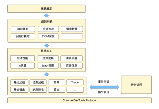 具體的實現(xiàn)方案,就是將 Soloπ 與待測應(yīng)用建立基于 CDP 協(xié)議建立 Websocket 通信,監(jiān)聽頁面發(fā)起請求、接收數(shù)據(jù)、開始加載等事件的回調(diào)、并收集報錯、Trace 等數(shù)據(jù)。再按照啟動性能、資源流耗、請求質(zhì)量、JS 質(zhì)量、 JSAPI 調(diào)用情況與頁面信息 6 大維度進行數(shù)據(jù)的分類和整理,隨后通過內(nèi)置的規(guī)則對采集到的結(jié)果進行判斷,最終生成報表并在界面中展示。