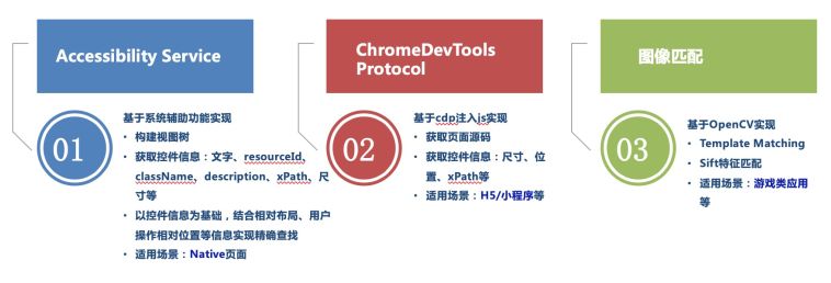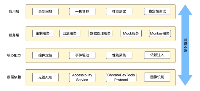 這套方案中,底層依賴主要是“無線 ADB、系統(tǒng)輔助功能、Chrome 調(diào)試以及圖像識別技術(shù)”,后文將會介紹它們具體的應(yīng)用場景。同時,在底層依賴的基礎(chǔ)上,我們封裝了一套核心能力,由“控件定位、事件驅(qū)動、性能采集以及依賴注入”組成,并在服務(wù)層實現(xiàn)了錄制、回放、數(shù)據(jù)處理等公共服務(wù)能力。在架構(gòu)的最頂端,結(jié)合界面交互邏輯包裝出了各個功能的入口。