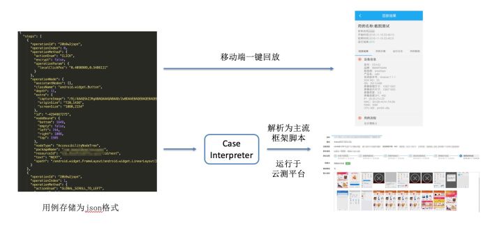 通過 Soloπ 錄制的用例會以 JSON 的形式存儲起來,用例不僅可以向上述視頻演示的一樣在設(shè)備本地直接回放,還可以通過 Soloπ 的解析器將用例轉(zhuǎn)換為 Appium、Macaca 等目前主流自動化測試框架的腳本,輕松打通云測平臺。另外,得益于文本抓取和圖像識別能力,Soloπ 還實現(xiàn)了在 Android 端錄制一遍用例,生成的腳本能夠同時在 Android、iOS 雙端回放的能力。