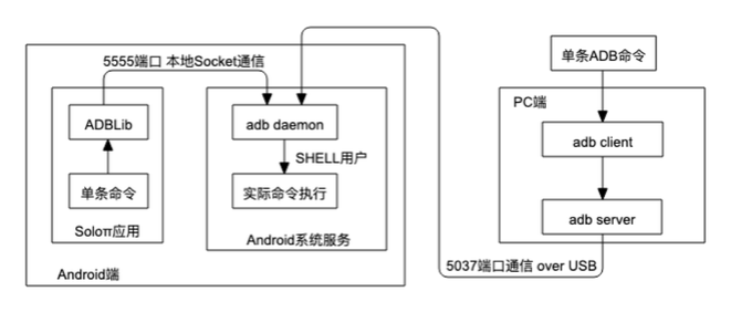在 PC 上,通過 Android SDK 提供的 ADB client 與同樣運行于 PC 中的 ADB server 通信,再由 ADB server 通過 USB 與位于設(shè)備中的 Adbd 通信。要實現(xiàn)一套無線化的方案,必須要擺脫對 USB 線的依賴。好在 Android 系統(tǒng)還提供了一種基于 Socket 的 ADB 連接模式,既然是這樣,那么只需要按照 ADB 通信協(xié)議在端上與本機的 5555 端口進行通信即可獲得 ADB shell 的執(zhí)行能力。