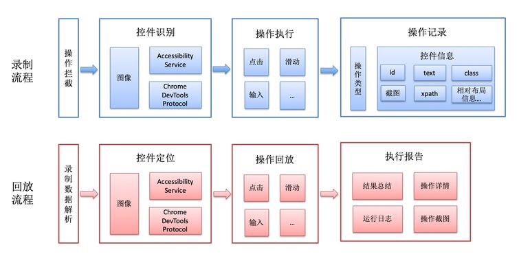 錄制回放功能基于 AccessibilityService、ChromeDevToolsProtocol、圖像識別三種模式實現(xiàn)精確查找,可以在設(shè)備本地實現(xiàn)回放,也可以轉(zhuǎn)換為 Appium/Macaca 等框架的腳本,對接云測平臺。另外,為了降低用例維護的成本,我們在端上還提供了用例編輯、流程控制的功能。