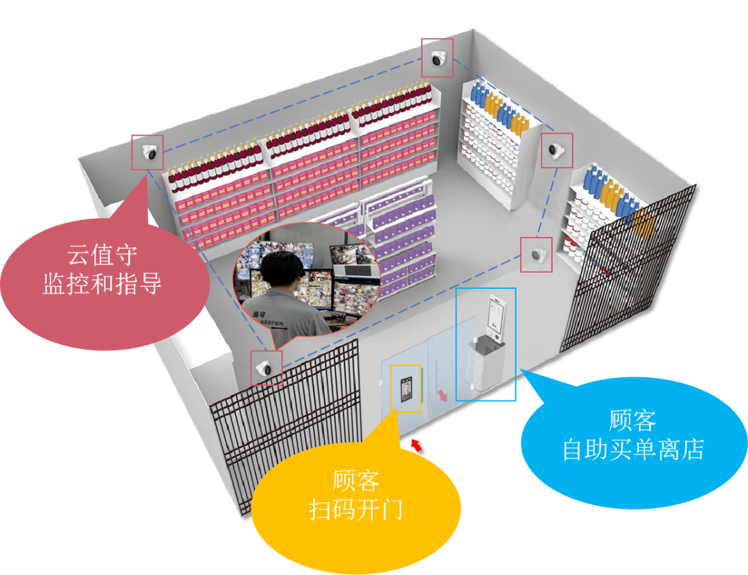 在不改變店鋪原有布置的基礎上,加裝智能門禁+自助收銀機+智能監(jiān)控,一天即可完成升級,上線后,實現(xiàn)有人、云值守托管自由切換,節(jié)省人工的同時,門店全天營業(yè).